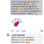 “Mr Manku i’m impressed about the work of your hands, your deco is more beautiful and food catering so delicious. Starter sona top. Ore diretxe monyanya wa maemo a godimo… Danko.”